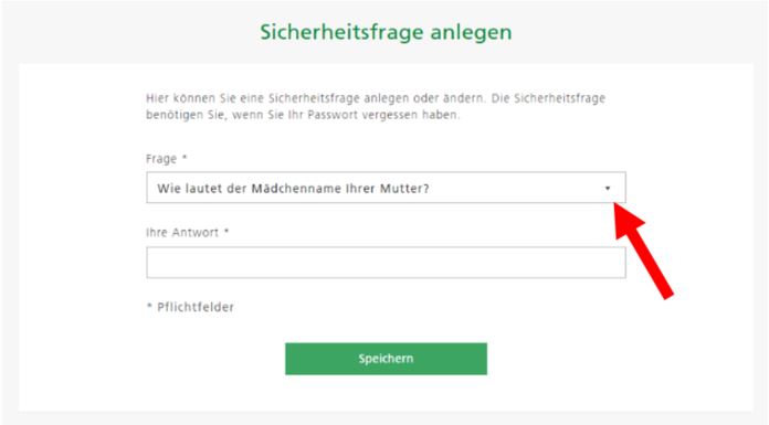 Klicken Sie auf den Pfeil. Dann können Sie sich eine Sicherheits-Frage aussuchen.